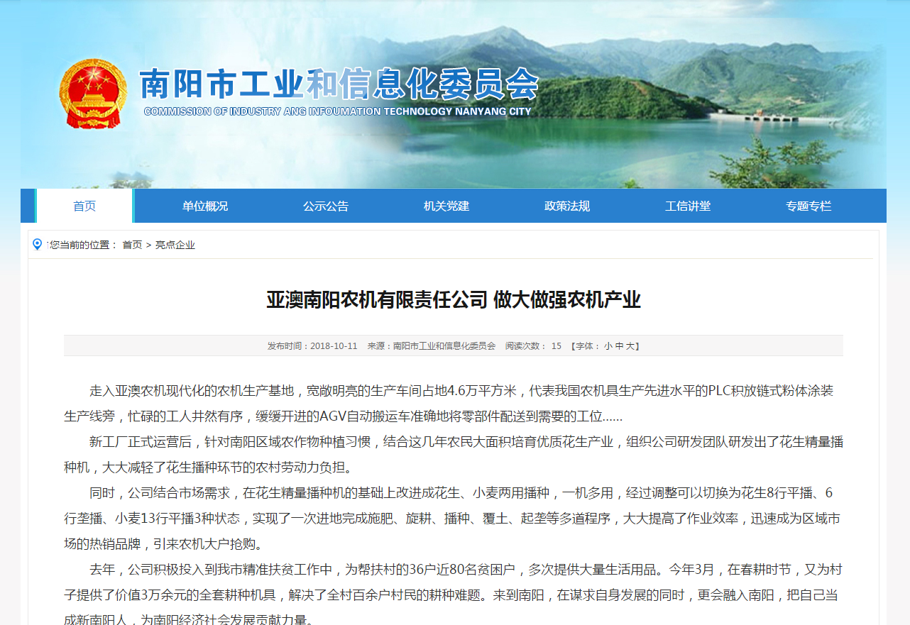 去年,公司積極投入到我市精準(zhǔn)扶貧工作中,為幫扶村的36戶近80名貧困戶,多次提供大量生活用品。今年3月,在春耕時節(jié),又為村子提供了價值3萬余元的全套耕種機具,解決了全村百余戶村民的耕種難題。來到南陽,在謀求自身發(fā)展的同時,更會融入南陽,把自己當(dāng)成新南陽人,為南陽經(jīng)濟(jì)社會發(fā)展貢獻(xiàn)力量。