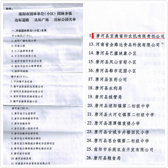 近日,南陽市公布了2018年度全市園林式居住區(qū)(單位)評選結(jié)果,亞澳南陽農(nóng)機(jī)有限責(zé)任公司榜上有名,榮獲市級“園林式單位”榮譽(yù)稱號。