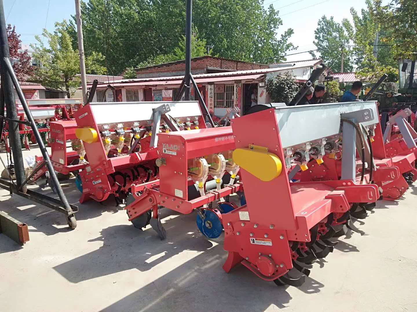 這款機(jī)具集旋耕、施肥、播種為一體。可用來(lái)播種小麥、花生、高粱、油菜等多種農(nóng)作物。農(nóng)藝順序?yàn)椋▎涡?施肥-旋耕-整平-播種-鎮(zhèn)壓。